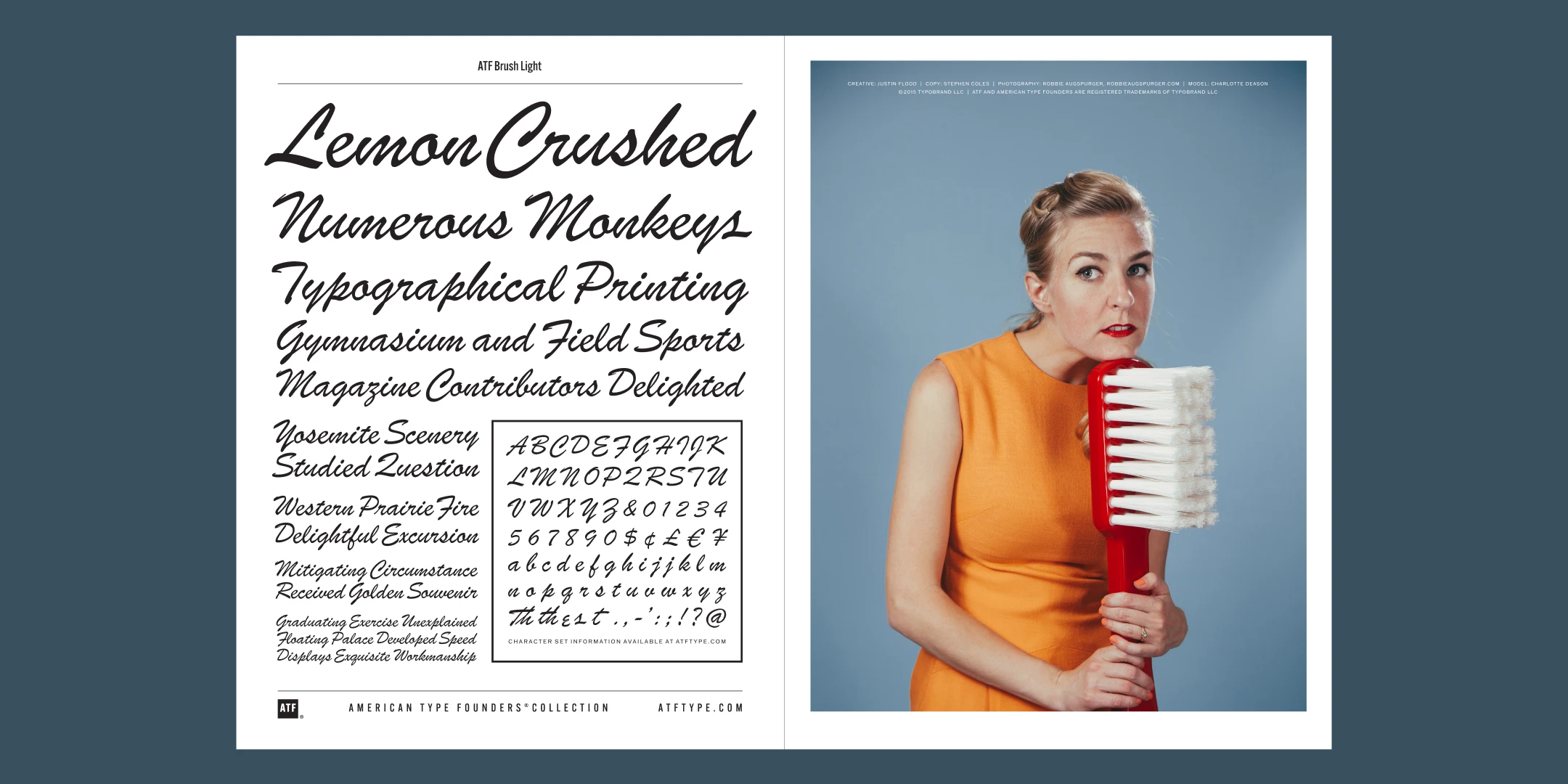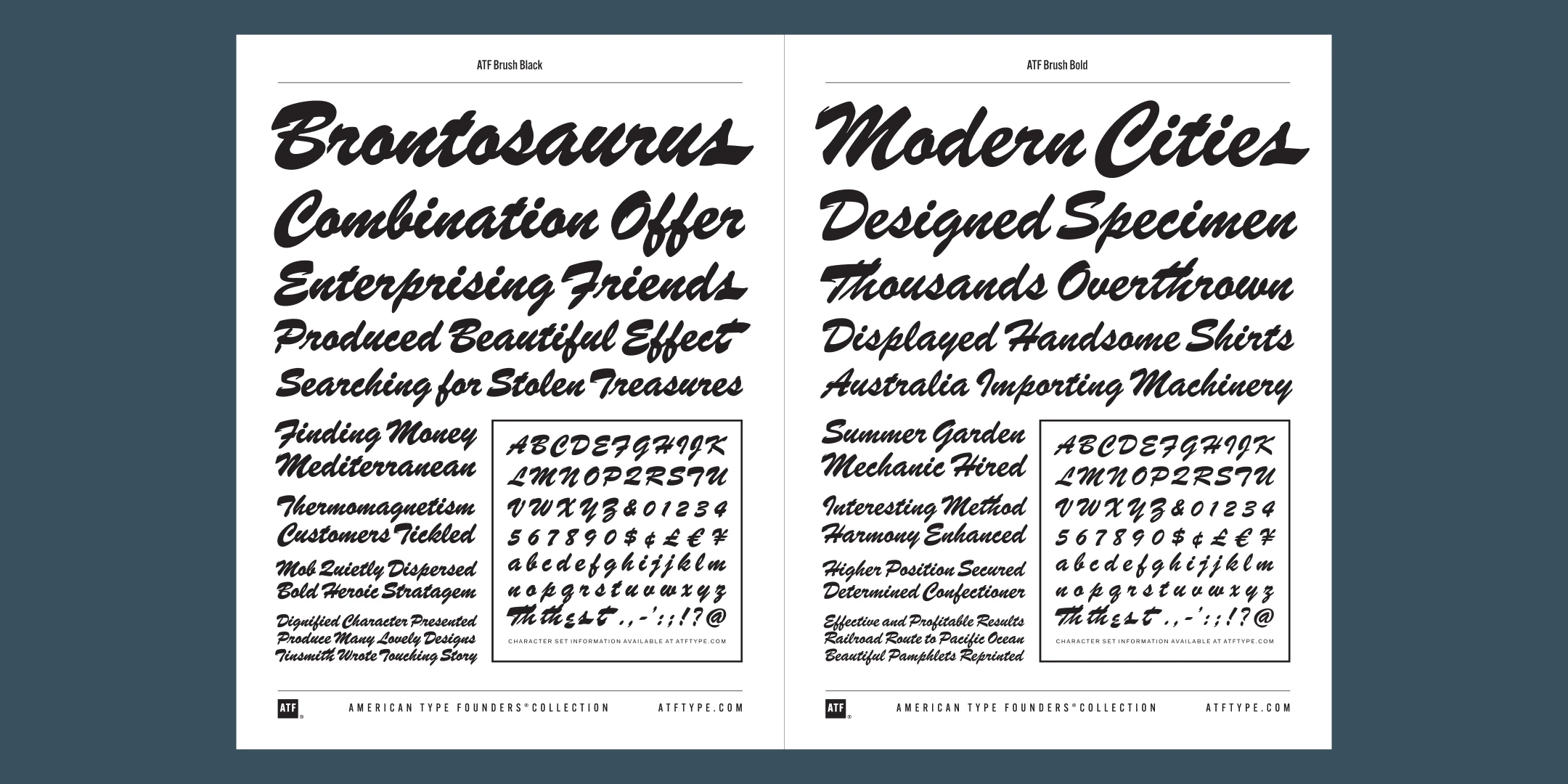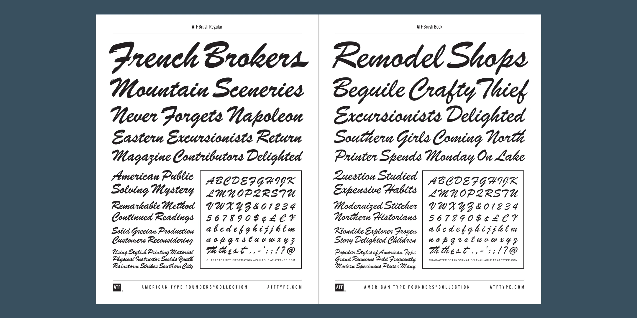 … beloved script emblem of plumbers, mechanics, bodegas, lunch counters, and other low-rent concerns. Since 1942, you have given faceless apartment buildings a name, brought life to the badges and banners of otherwise tedious trade conventions, and lent excitement to the postcards of middle America’s unsung travel destinations. We have seen so much of you … but not enough! We need more weights: how about five? We want swash alternates, too, plus lively ligatures, and sporty underline tails! Give us cleaner curves and smoother connections, but stay true to your frisky self! Like a nail salon that offers cucumber water, the new ATF Brush is one step classier than the rest.