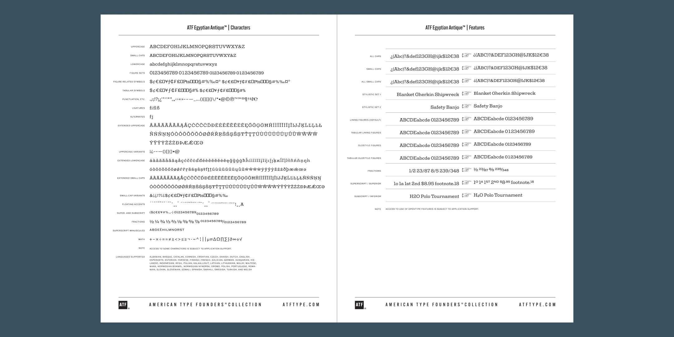 ATF Egyptian Antique is an expansion of Schruabstädter’s design to six weights. A new feature is the addition of small caps, essential for headings and useful as alternative capitals in upper-and-lowercase settings. The x-height has been slightly increased to better balance with the caps, and while some letterforms have been refined, the family stays true to the eccentricities and antique quality of Schraubstädter’s Egyptian gem.