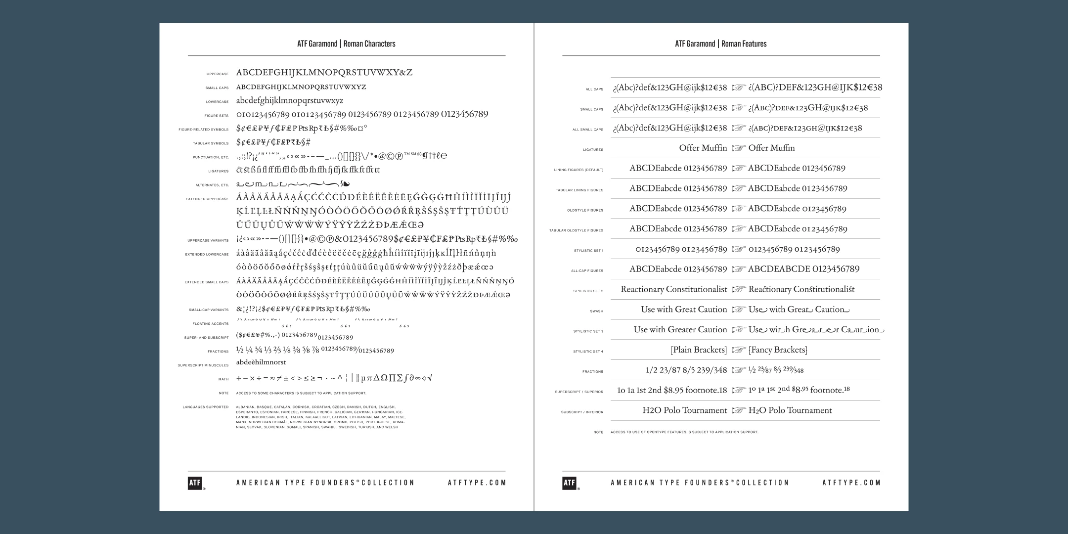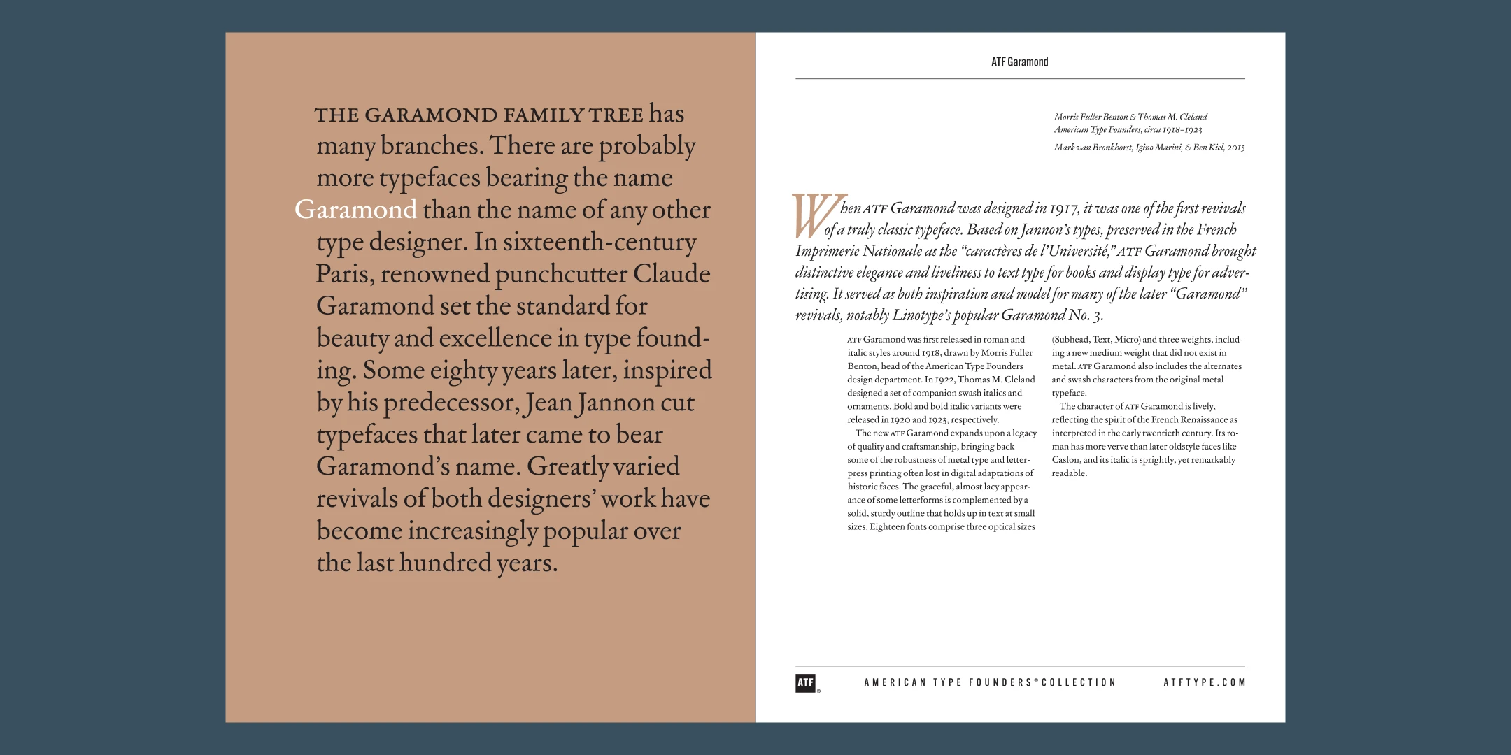 The character of ATF Garamond is lively, reflecting the spirit of the French Renaissance as interpreted in the early twentieth century. Its roman has more verve than later oldstyle faces like Caslon, and its italic is sprightly, yet remarkably readable.
