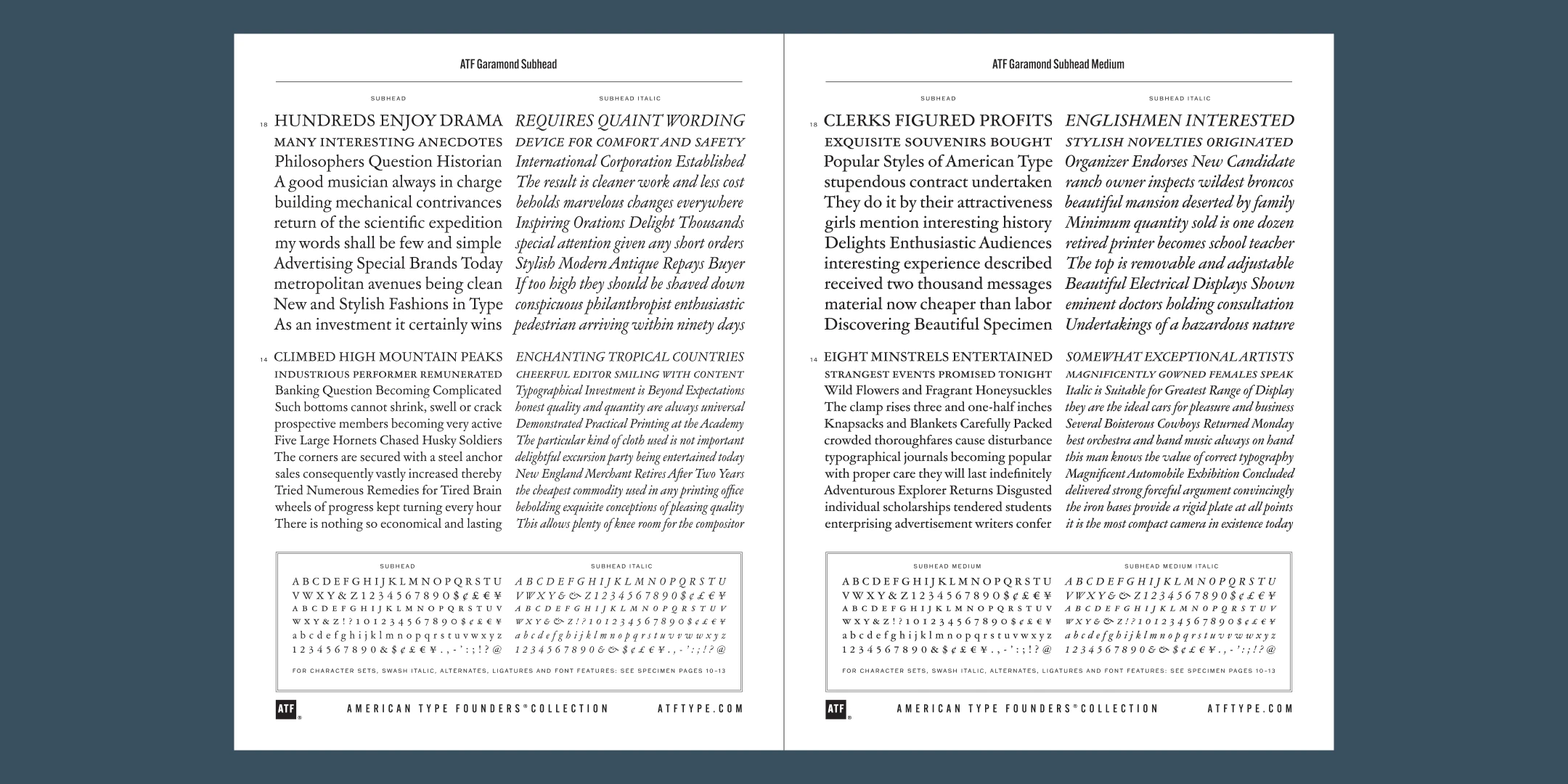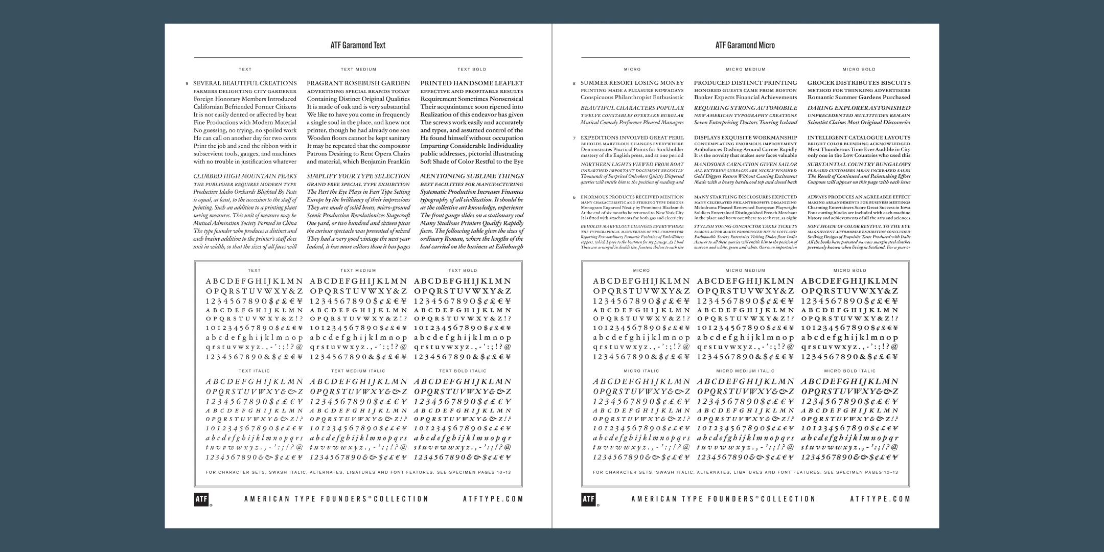 The new ATF Garamond expands upon a legacy of quality and craftsmanship, bringing back some of the robustness of metal type and letterpress printing often lost in digital adaptations of historic faces. The graceful, almost lacy appearance of some letterforms is complemented by a solid, sturdy outline that holds up in text at small sizes. Eighteen fonts comprise three optical sizes (Subhead, Text, Micro) and three weights, including a new medium weight that did not exist in metal. ATF Garamond also includes the alternates and swash characters from the original metal typeface.