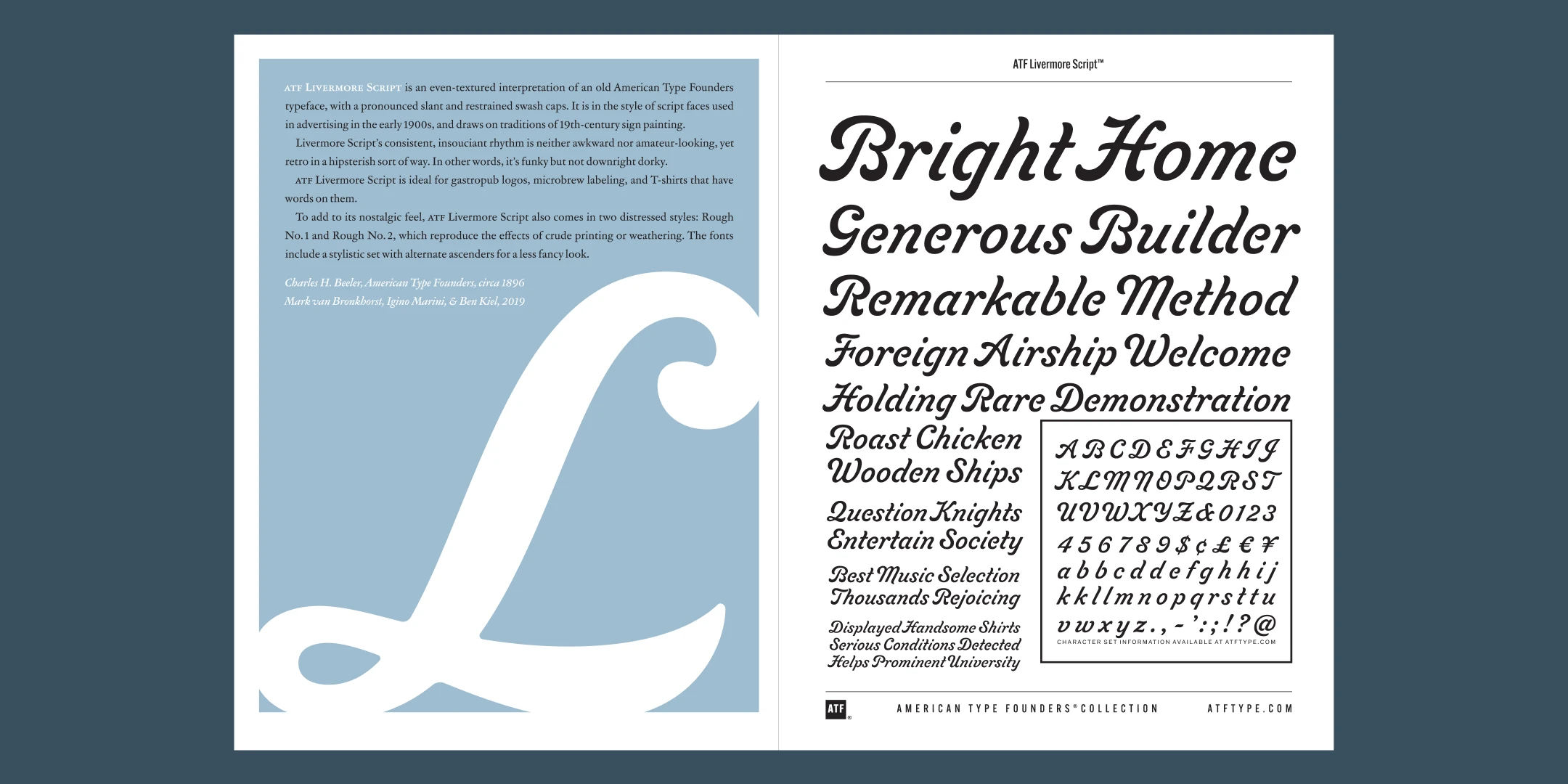 ATF Livermore Script is an even-textured interpretation of an old American Type Founders typeface, with a pronounced slant and restrained swash caps. It is in the style of script faces used in advertising in the early 1900s, and draws on traditions of 19th-century sign painting.