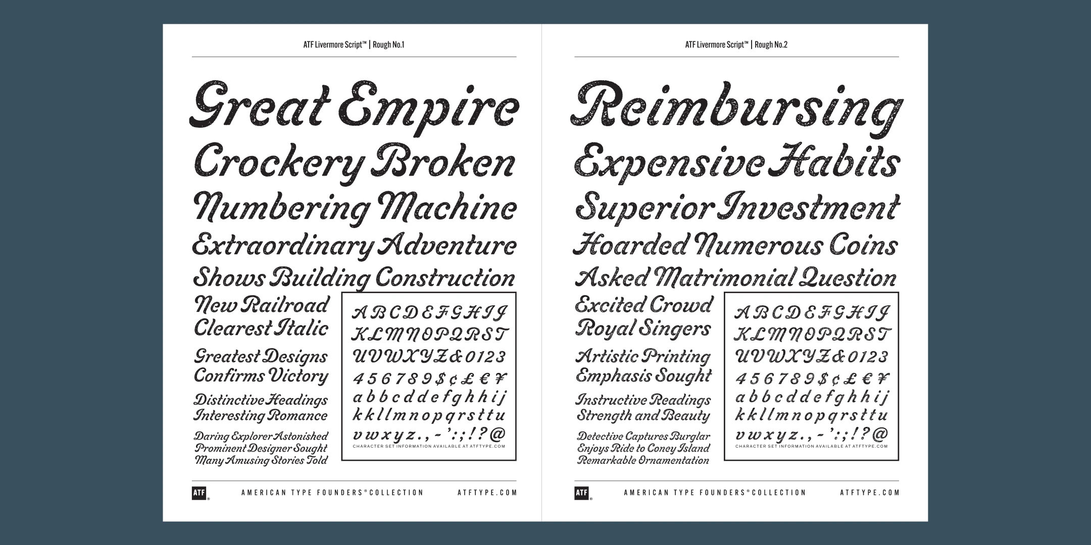To add to its nostalgic feel, ATF Livermore Script also comes in two distressed styles: Rough No. 1 and Rough No. 2, which reproduce the effects of crude printing or weathering. The fonts include a stylistic set with alternate ascenders for a less fancy look.