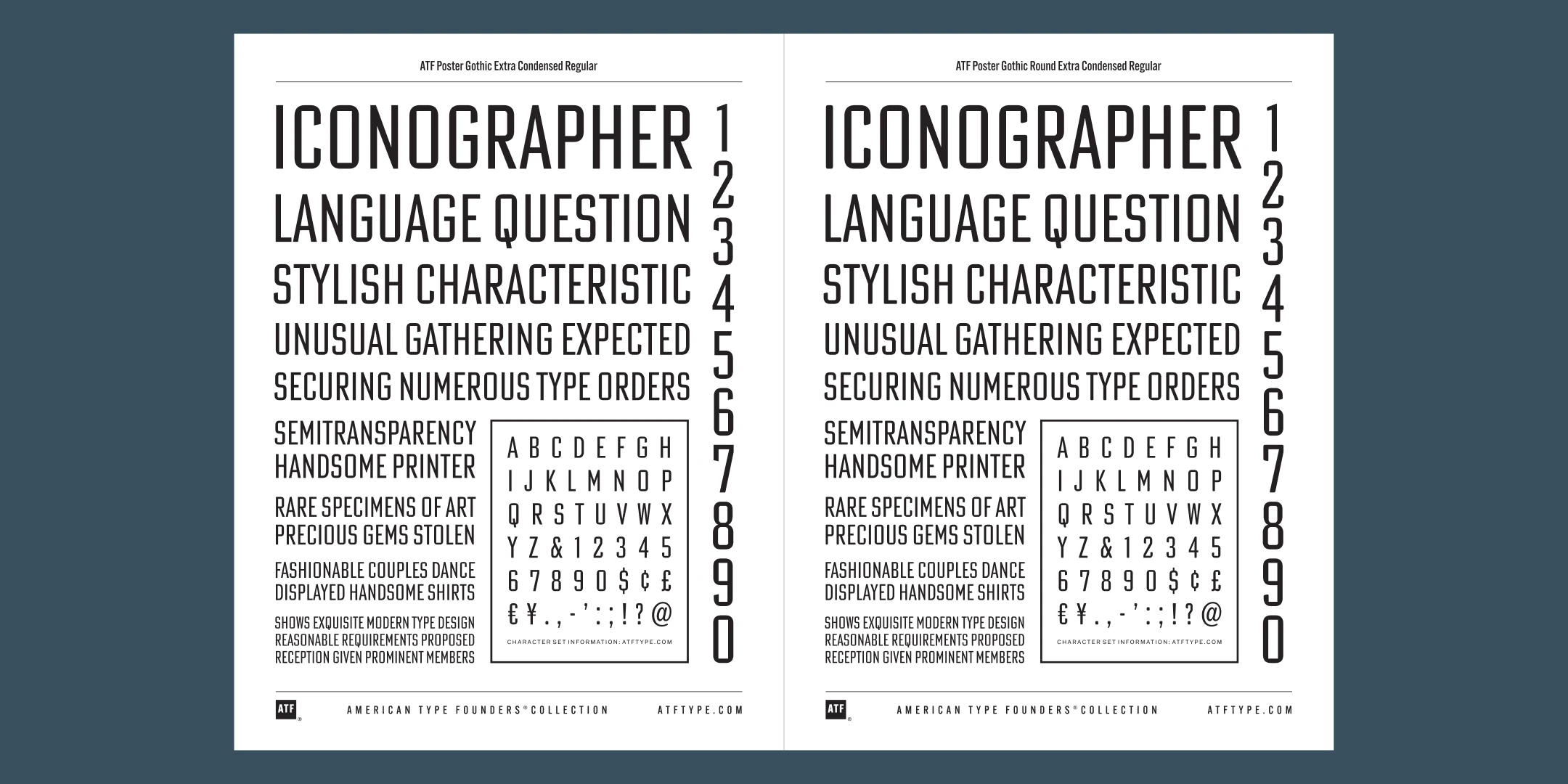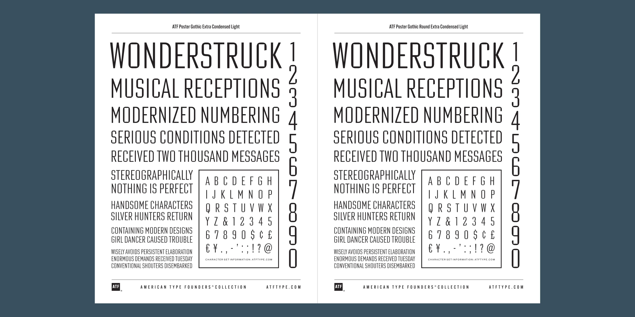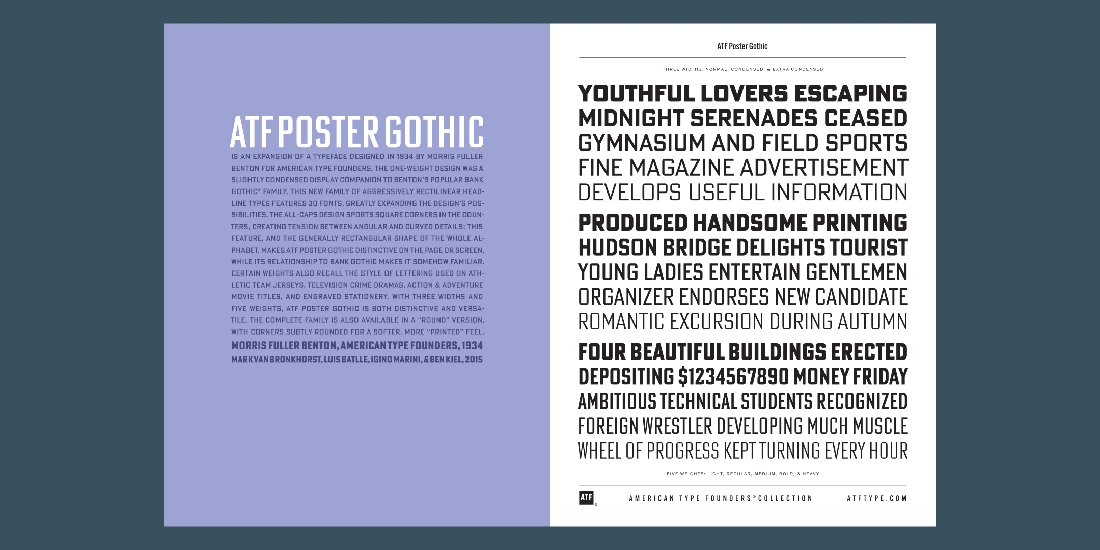 Certain weights also recall the style of lettering used on athletic team jerseys, television crime dramas, action & adventure movie titles, and engraved stationery. With three widths and five weights, ATF Poster Gothic is both distinctive and versatile. The complete family is also available in a “Round” version, with corners subtly rounded for a softer, more “printed” feel.