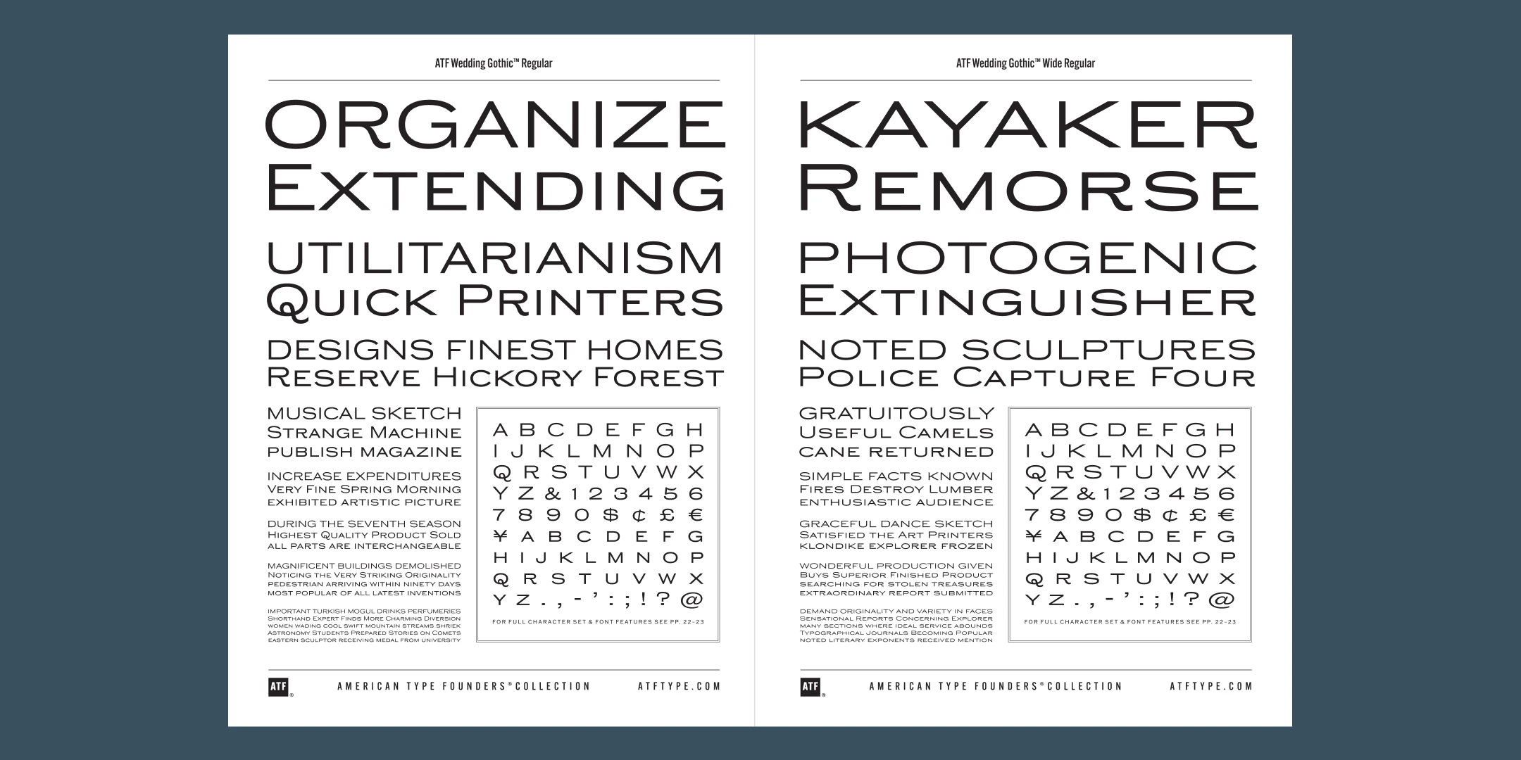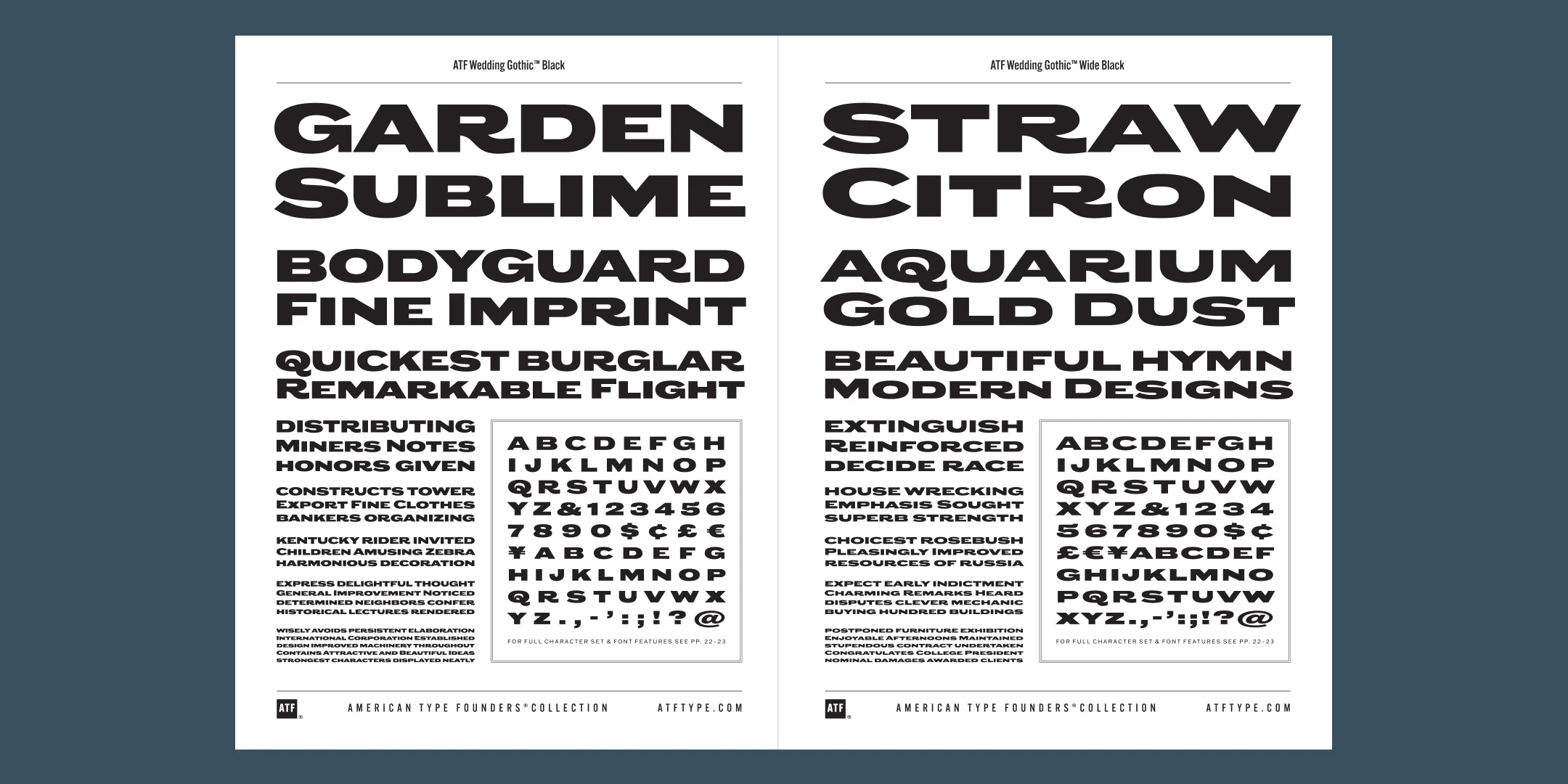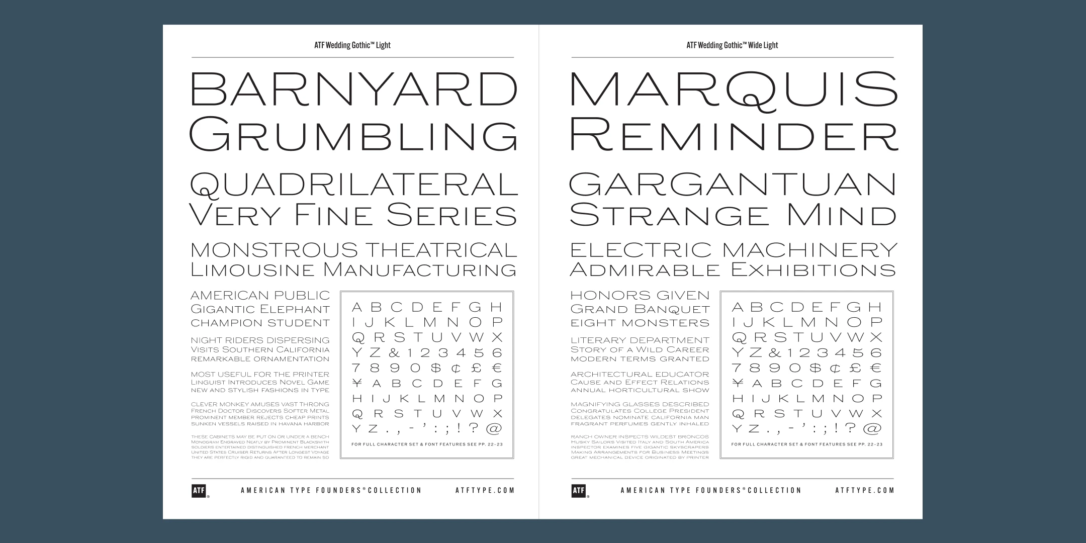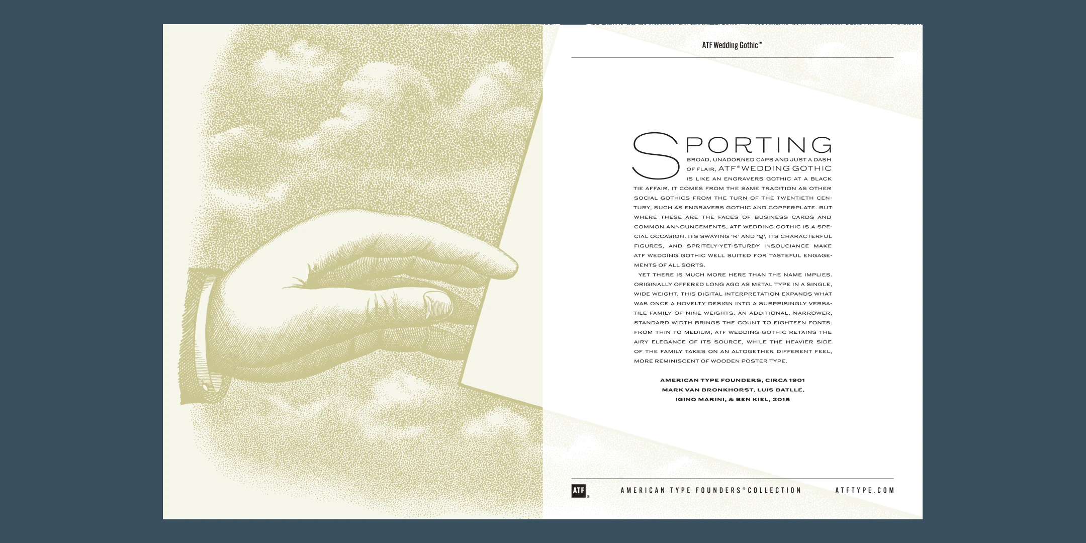 Sporting broad, unadorned caps and just a dash of flair, ATF Wedding Gothic™ is like an engravers gothic at a black tie affair. It comes from the same tradition as other social gothics from the turn of the twentieth century, such as Engravers Gothic and Copperplate. But where these are the faces of business cards and common announcements, ATF Wedding Gothic is a special occasion. Its swaying ‘R’ and ‘Q’, its characterful figures, and spritely-yet-sturdy insouciance make ATF Wedding Gothic well suited for tasteful engagements of all sorts.