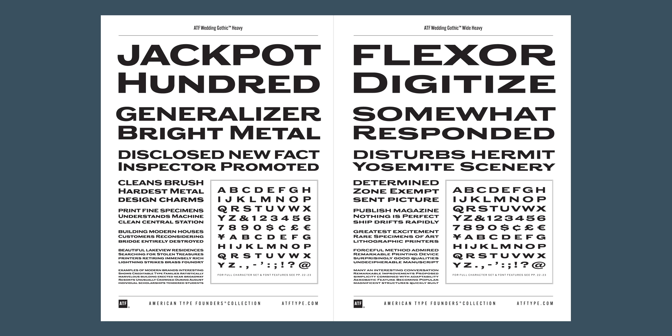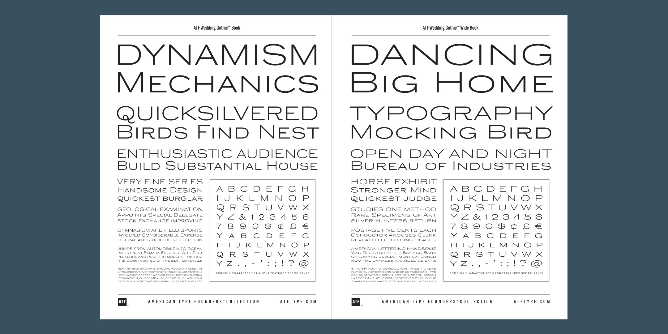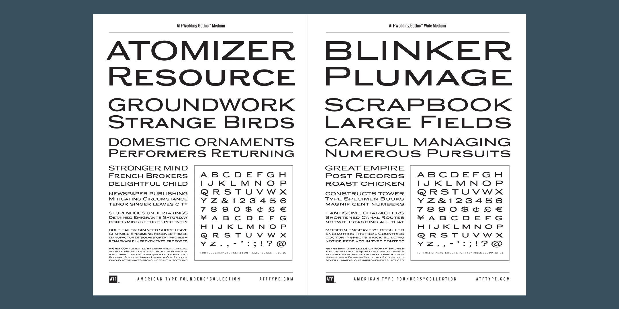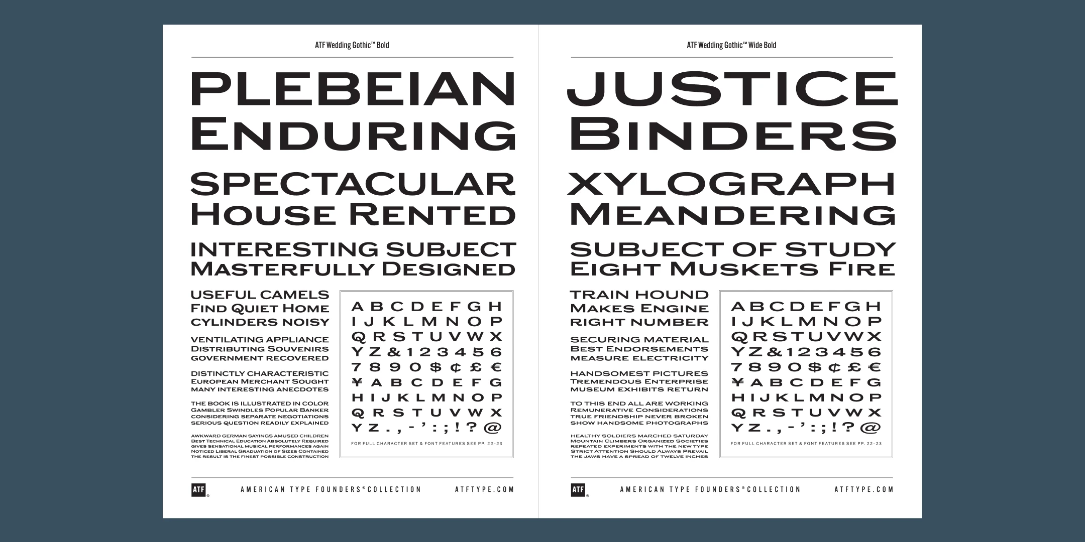 Sporting broad, unadorned caps and just a dash of flair, ATF Wedding Gothic™ is like an engravers gothic at a black tie affair. It comes from the same tradition as other social gothics from the turn of the twentieth century, such as Engravers Gothic and Copperplate. But where these are the faces of business cards and common announcements, ATF Wedding Gothic is a special occasion. Its swaying ‘R’ and ‘Q’, its characterful figures, and spritely-yet-sturdy insouciance make ATF Wedding Gothic well suited for tasteful engagements of all sorts.