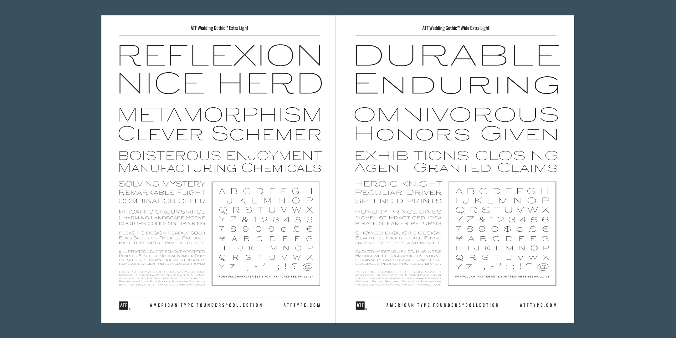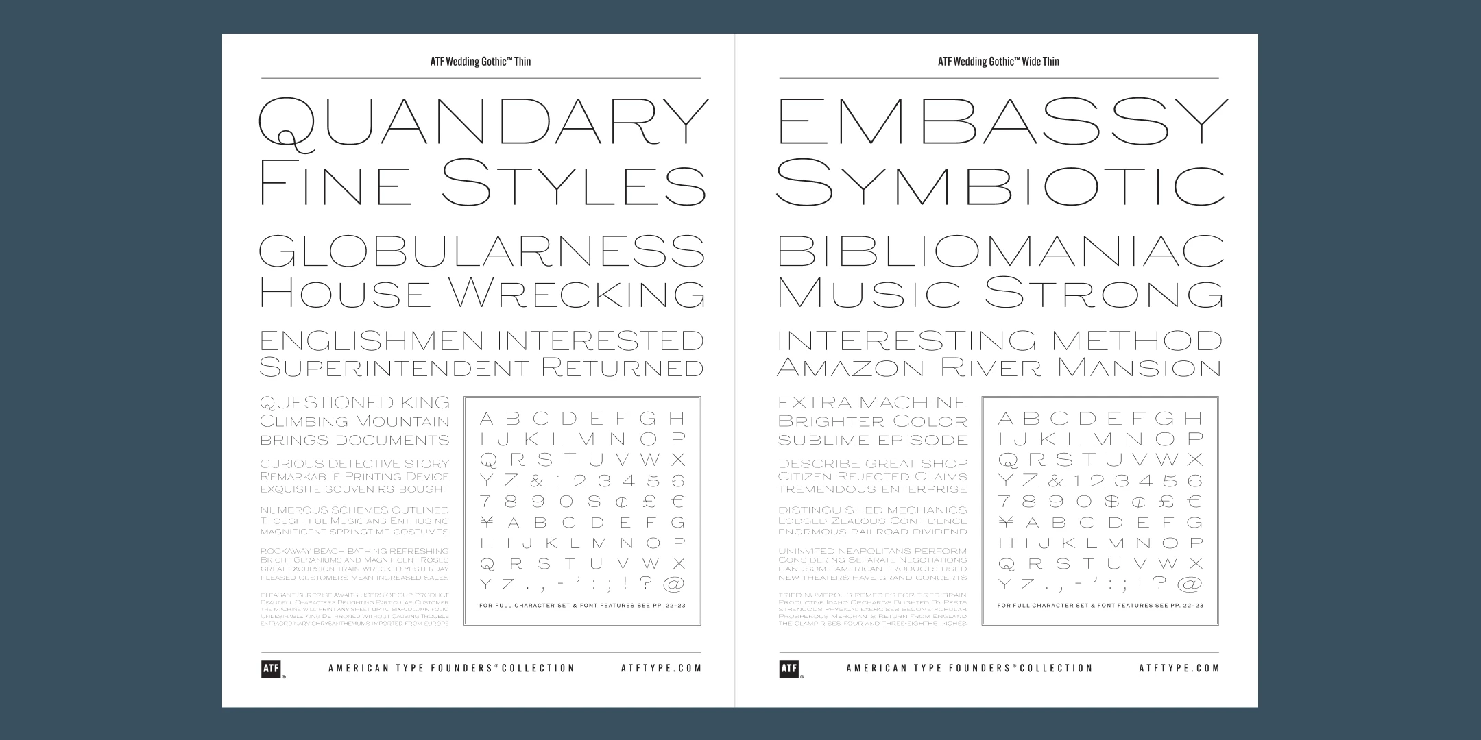 Yet there is much more here than the name implies. Originally offered long ago as metal type in a single, wide weight, this digital interpretation expands what was once a novelty design into a surprisingly versatile family of nine weights. An additional, narrower, standard width brings the count to eighteen fonts. From Thin to Medium, ATF Wedding Gothic retains the airy elegance of its source, while the heavier side of the family takes on an altogether different feel, more reminiscent of wooden poster type.